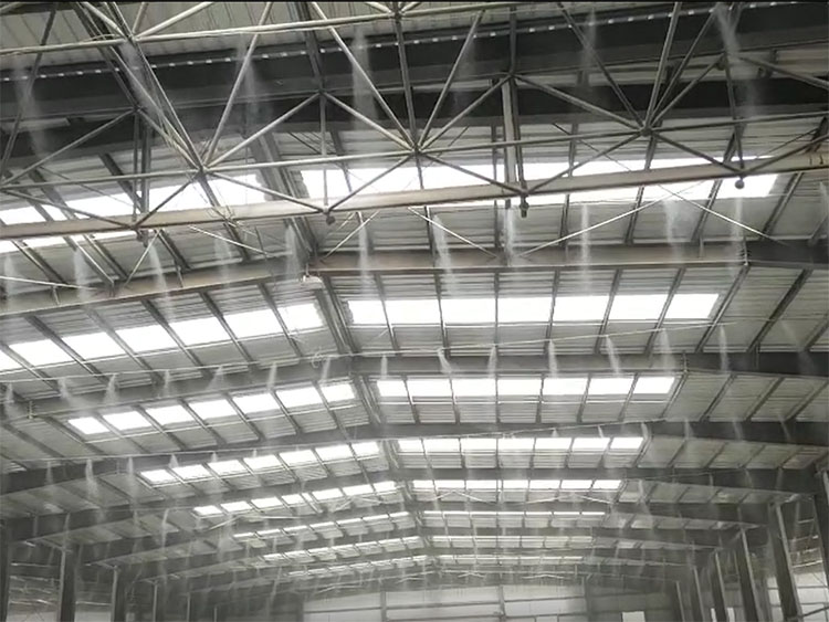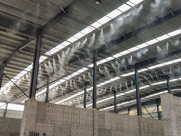 利用高壓泵將經(jīng)過水處理系統(tǒng)凈化過的水加壓,高壓噴咀霧化,霧化顆粒能長時間漂浮在空氣中,吸附懸浮在空氣中的粉塵,使粉塵受重力作用而沉降,從而達到抑塵作用。